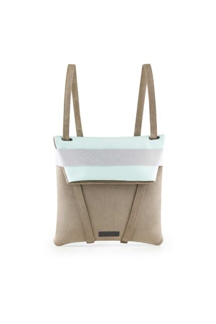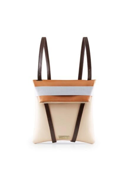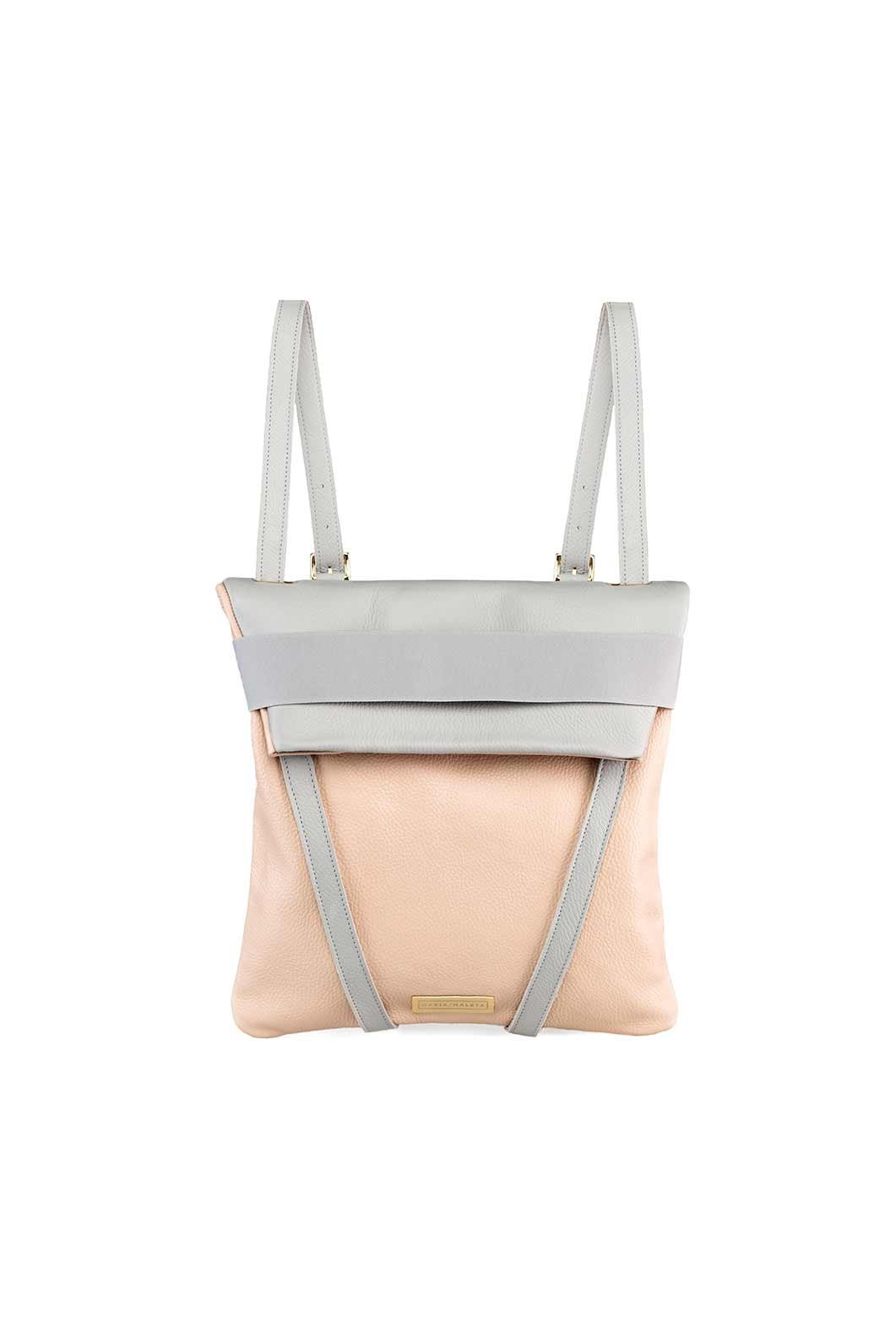 Women’s Backpack in leather. Blush leather and light grey leather. Grey elastic. and adjustable straps 70cm 80cm. Two inner pockets. Dimensions:  35 x 33 cm. With an extra handle strap. REF. MMBPR1 Made in Portugal