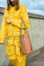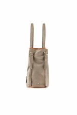 Caramel-brown leather in one side. Back in grey suede. Both sides with golden pin.  Adjustable straps in Grey Suede. One inner pocket with zipper. Dimensions W: Ø 18 cm H: 34cm. Adjustable Straps:  50cm – 100cm.